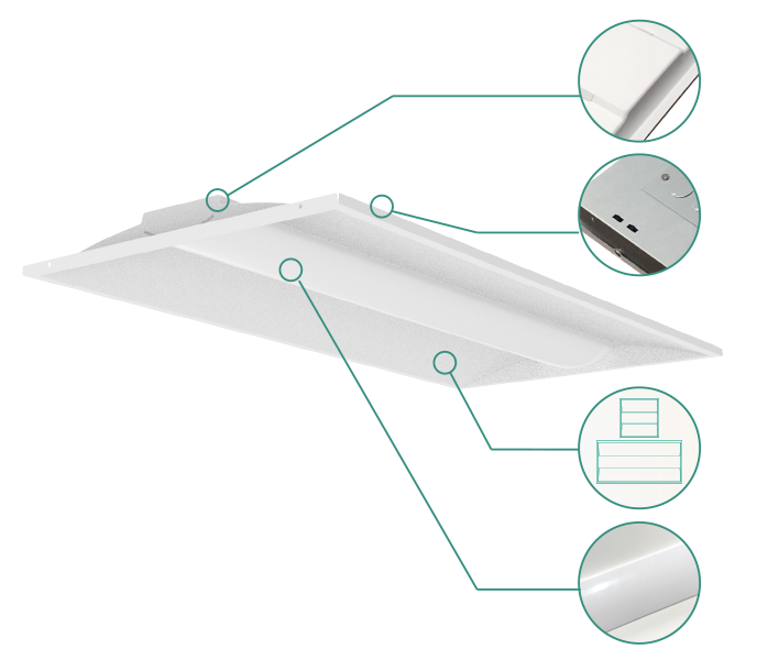 The slim LED troffers features a popular center basket design offers a clean, versatile style and volumetric distribution. It is typically used to replace 2×2 and 2×4 Troffer fluorescent light fixtures.