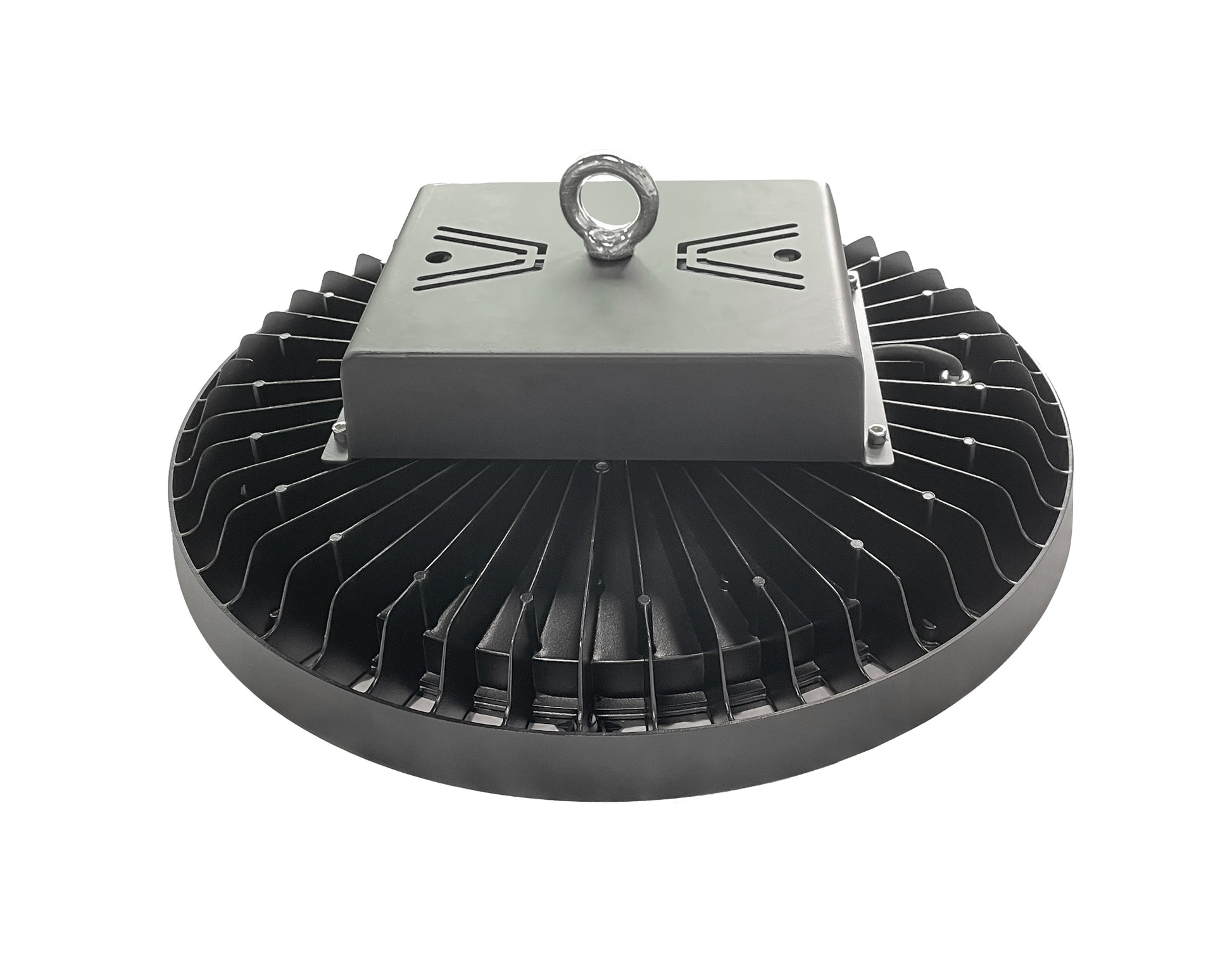 Premium HIGH OUTPUT indoor luminaire for hanging or pendant mounting in high ceiling spaces above 50 feet. Suitable for gymnasiums, warehouses, manufacturing, packaging, storage, aisles, and covered decks.